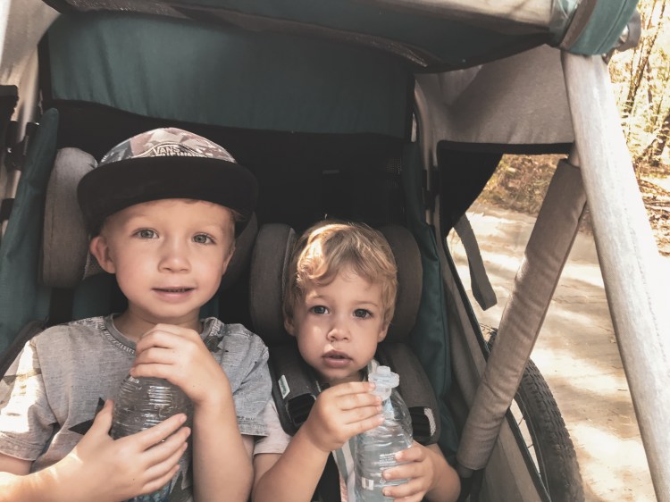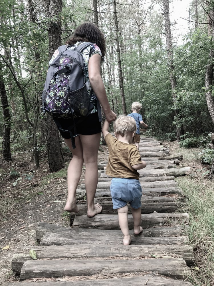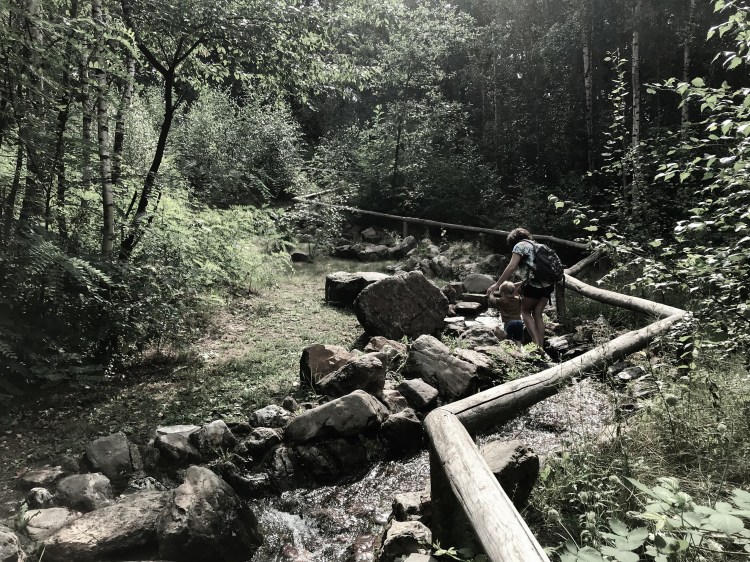 Nous suivons le sentier, Léo grimpe sur des bois, Isaac saute dans les flaques. Papa et Maman grimacent… mais finalement c’est bien pour ça que nous sommes là.