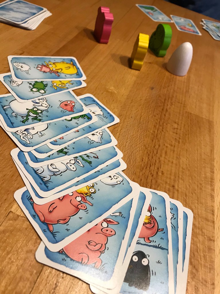 Bazar Bizarre Junior : on retourne une carte de la pioche. Quel animal sur la carte à la même couleur que les statuettes? Attrapez-Le en premier et empochez la carte. Simple mais efficace. Dès 3 ans chez Gigamic (là par contre 3, ça semble jeune…)