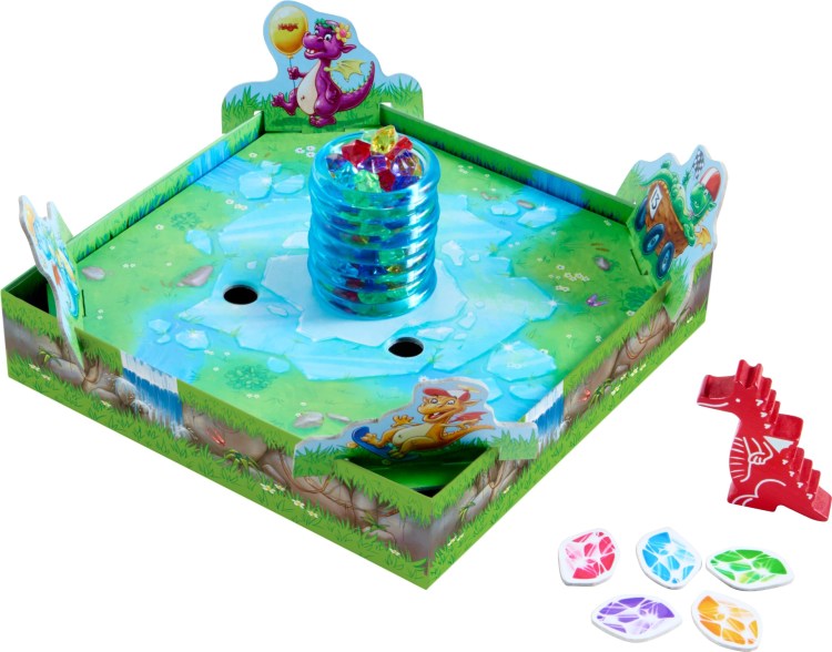 Trésor de glace : chacun votre tour, vous choisissez une couleur de pierre, vous incarnez « Papa Dragon » et crachez la feu sur la montagne de glace. Un peu d’analyse et d’habileté vous feront récolter un maximum de pierres précieuses. Dès 5 ans chez Haba (mais pareil, Léo y joue depuis ses 4 ans, ne vous fiez pas à l’âge recommandé).
