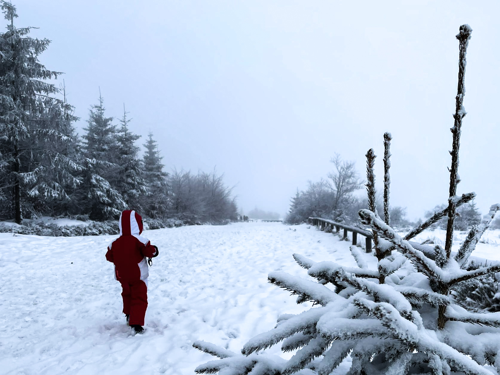 Léo et papa se lancent à l’assaut de la petite balade de 2,5km (balisage bleu). Tandis qu’Isaac et maman profitent de la neige. Les sentiers hors période hivernale sont normalement accessibles aux poussettes.