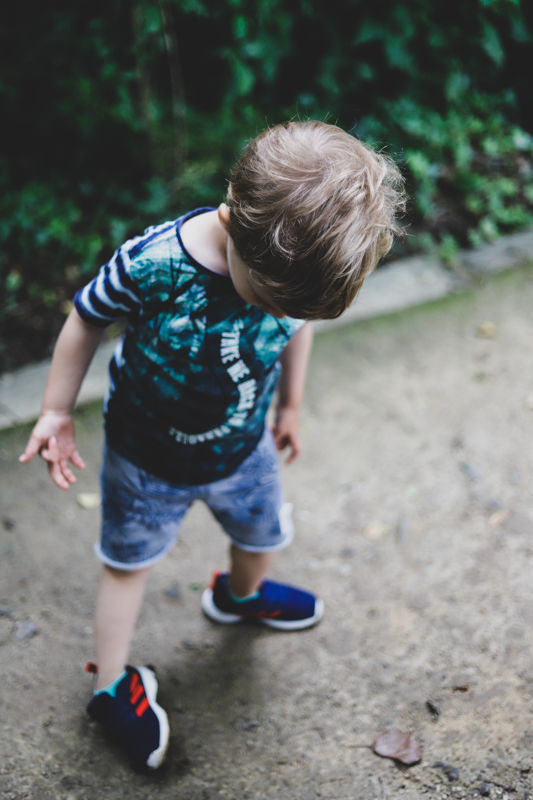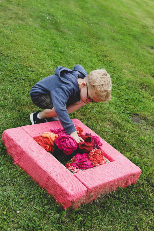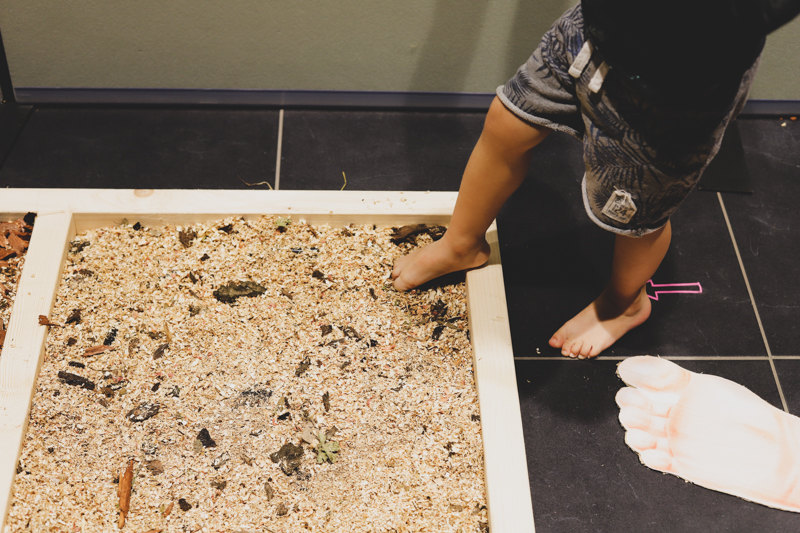Suivez les flèches et décorations de laine, qui stimulent le toucher, jusqu’à l’espace. On y enlève à nouveau ses chaussures, ce qui prend souvent autant de temps que l’activité en elle-même. Et c’est reparti pour un parcours pieds nus, beaucoup plus grand que celui de ReGare, et en extérieur. Léo s’y aventure, grimace quand ça fait mal, et poursuit jusqu’au bout. Isaac quant à lui aura fait 1 bon mètre.