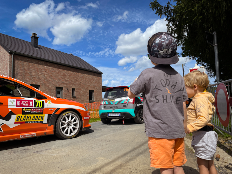 On se trompe de route pour sortir du village et… nous voilà en dessous de la ligne de départ de la spéciale qui démarre dans 20‘. Vous pensez bien, Papa se sent pousser des ailes à parcourir, sous les yeux des supporters massés derrière les barrières, les premiers hectomètres de la spéciale.