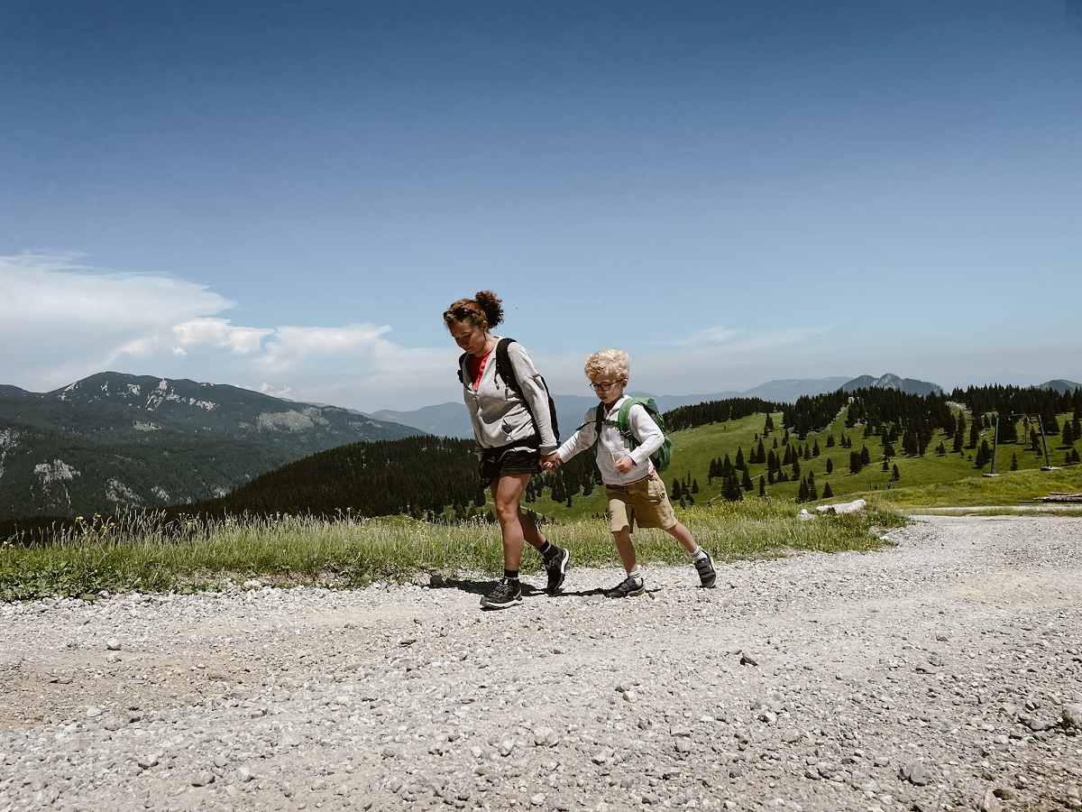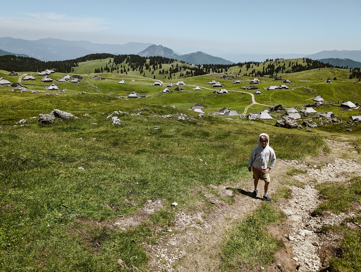 Une fois au-dessus, nous faisons le tour du village, ce qui représente une petite marche de 3-4 km. Isaac caresse les veaux, Maman fait un selfie avec les vaches, et Léo jette ses dernières forces dans la petite randonnée. Il y a quelques vendeurs de produits locaux, ainsi qu’un petit restaurant qui sert des plats typiques (nous avons testé une potée au légume et une choucroute slovène).