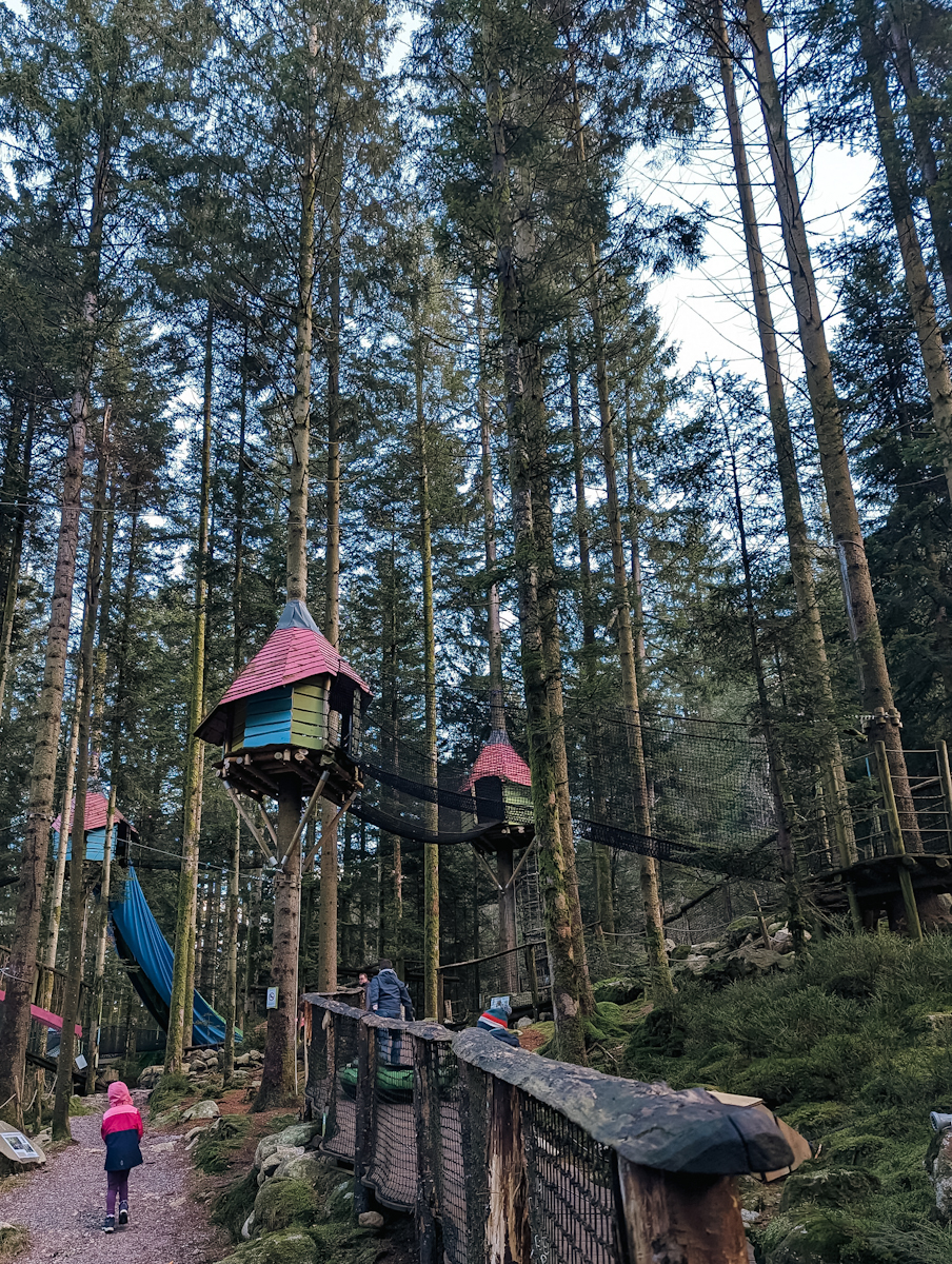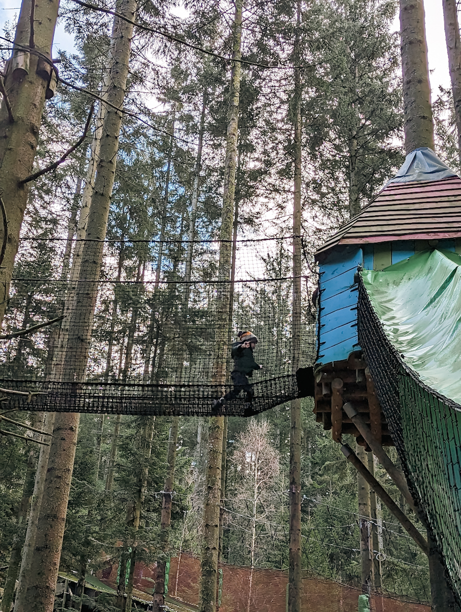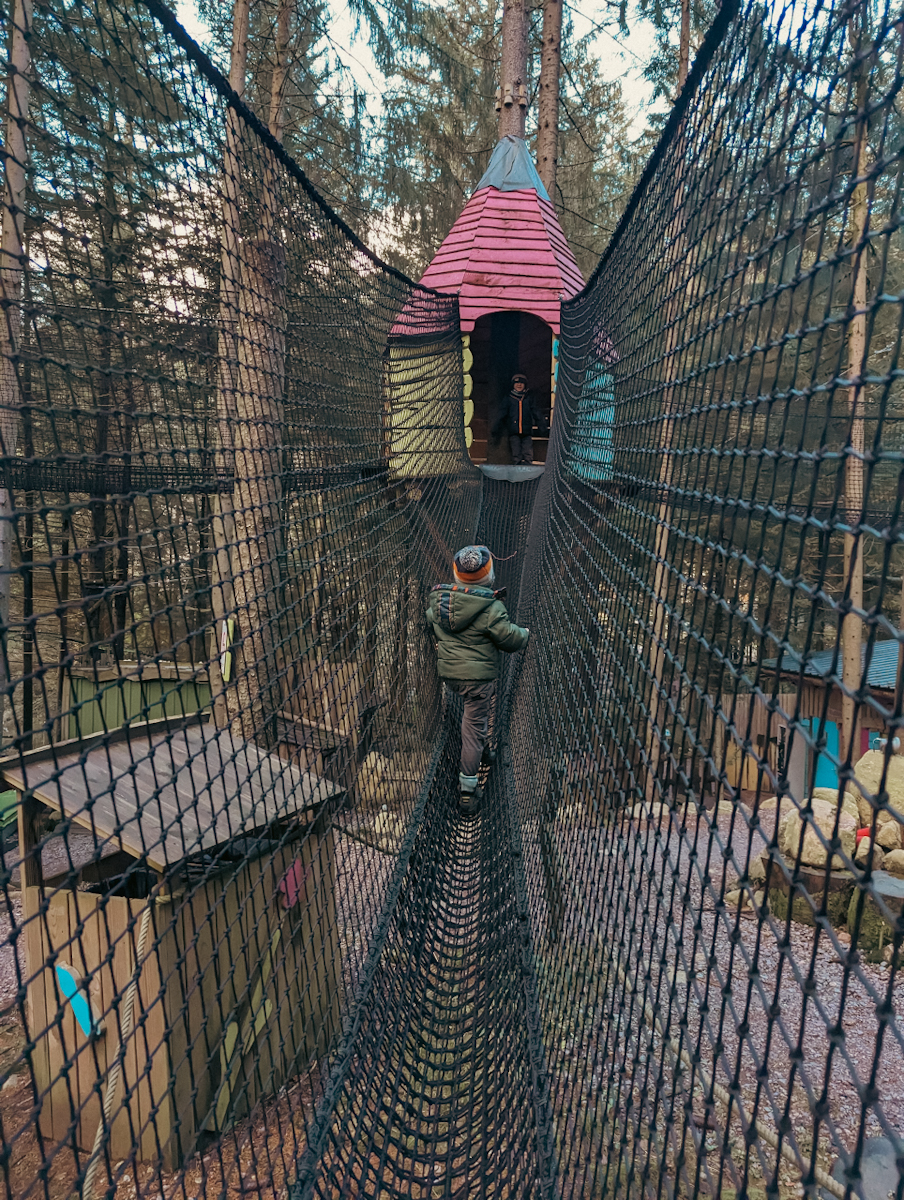 Contrairement à l’accrobranche, aucune sécurisation avec baudrier : tout le parcours se fait dans des filets. C’est très fluide, adapté également aux plus jeunes.
