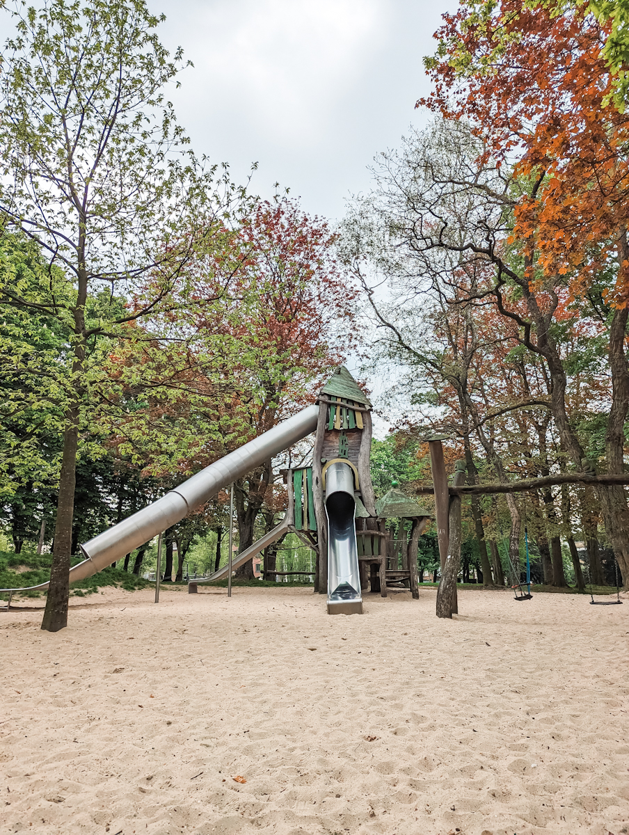L’endroit idéal pour un petit lunch en terrasse, au milieu des bois … et face à la superbe plaine de jeux en bois. La photo n’est qu’une infime partie de la plaine.