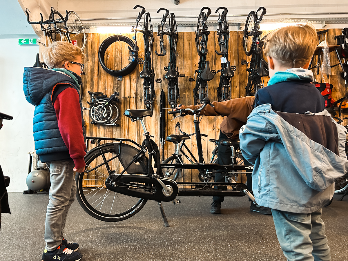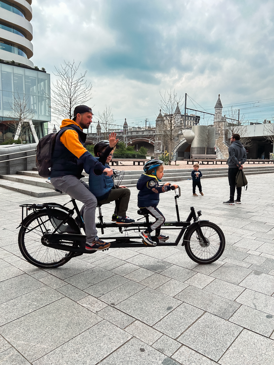 A la sortie de la (superbe) gare centrale, nous faisons un stop chez Cyclant : un vélo de ville pour Sarah et un tandem à 3 selles pour Kevin et les garçons. Le convoi est prêt à démarrer.