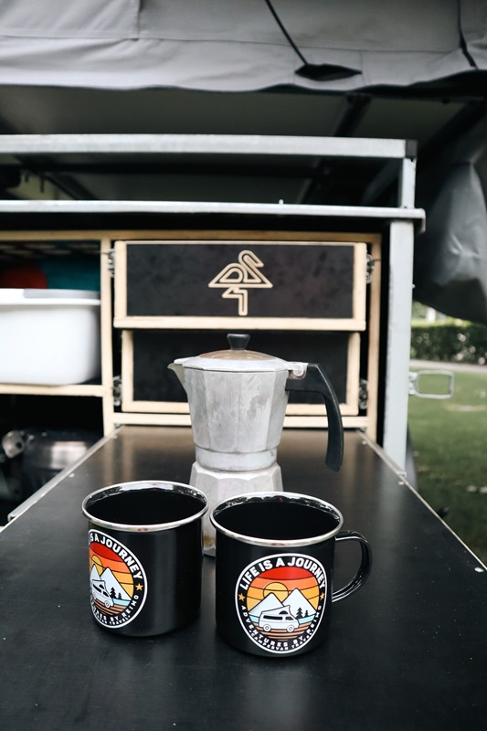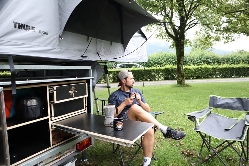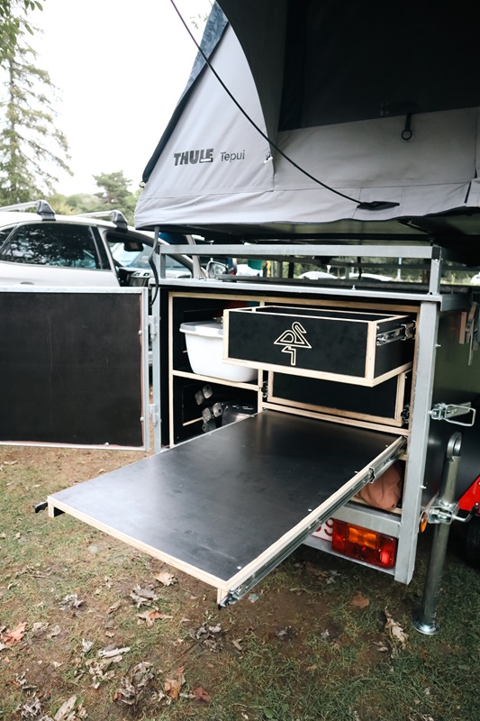 Et plusieurs m’ont demandé si c’est facile à conduire. En fait… tu ne la sens pas! - Nouvel espace de vie : avec la tente, tu dois installer une table pour cuisiner, laisser la vaisselle en bacs, etc. Ici, tu ouvres l’arrière de la remorque. Tiroirs, table pour préparer le repas et cuisiner. C’est un espace qu’on retrouvait dans notre van en Australie (nostalgie…).